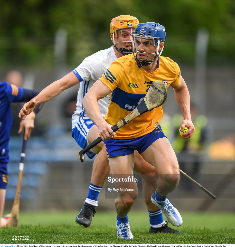 22 May 2022; Rory Hayes of Clare prepares to clear under pressure from Jack Prendergast of Waterford during the Munster GAA Hurling Senior Championship Round 5 match between Clare and Waterford at Cusack Park in Ennis, Clare. Photo by Ray McManus/Sportsfile
