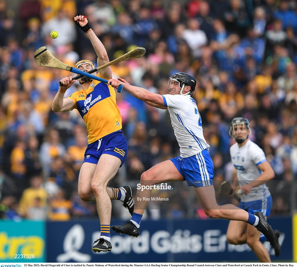 22 May 2022; David Fitzgerald of Clare is tackled by Pauric Mahony of Waterford during the Munster GAA Hurling Senior Championship Round 5 match between Clare and Waterford at Cusack Park in Ennis, Clare. Photo by Ray McManus/Sportsfile