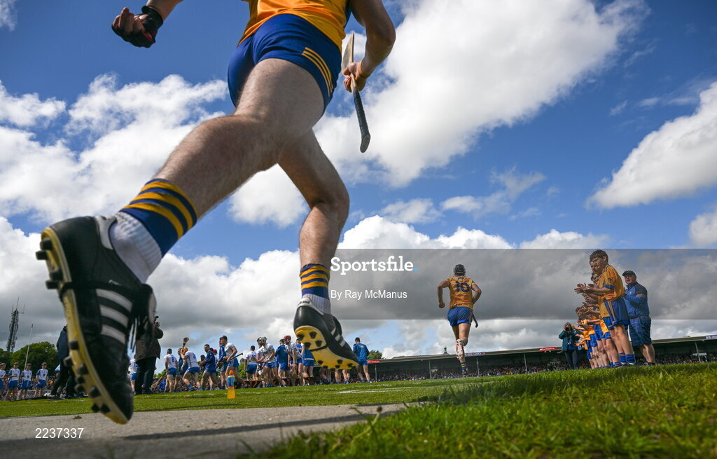22 May 2022; Cathal Malone, 10, and David Fitzgerald of Clare, left, run out for the start, as the Waterford players disperse after their team photograph, ahead of the Munster GAA Hurling Senior Championship Round 5 match between Clare and Waterford at Cusack Park in Ennis, Clare. Photo by Ray McManus/Sportsfile