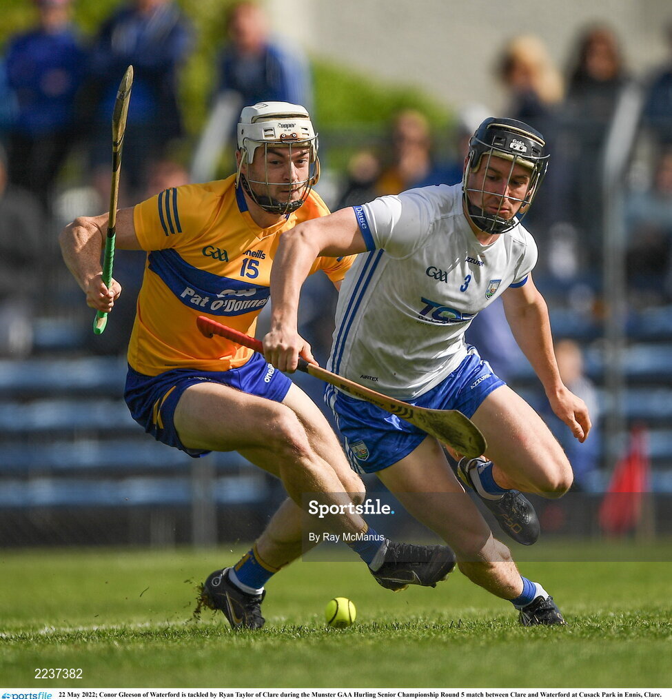 22 May 2022; Conor Gleeson of Waterford is tackled by Ryan Taylor of Clare during the Munster GAA Hurling Senior Championship Round 5 match between Clare and Waterford at Cusack Park in Ennis, Clare. Photo by Ray McManus/Sportsfile