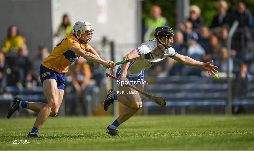 22 May 2022; Conor Gleeson of Waterford is tackled by Ryan Taylor of Clare during the Munster GAA Hurling Senior Championship Round 5 match between Clare and Waterford at Cusack Park in Ennis, Clare. Photo by Ray McManus/Sportsfile