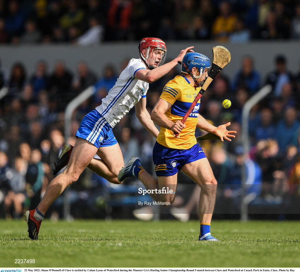 22 May 2022; Shane O'Donnell of Clare is tackled by Calum Lyons of Waterford during the Munster GAA Hurling Senior Championship Round 5 match between Clare and Waterford at Cusack Park in Ennis, Clare. Photo by Ray McManus/Sportsfile