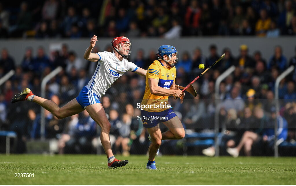 22 May 2022; Shane O'Donnell of Clare is tackled by Calum Lyons of Waterford during the Munster GAA Hurling Senior Championship Round 5 match between Clare and Waterford at Cusack Park in Ennis, Clare. Photo by Ray McManus/Sportsfile