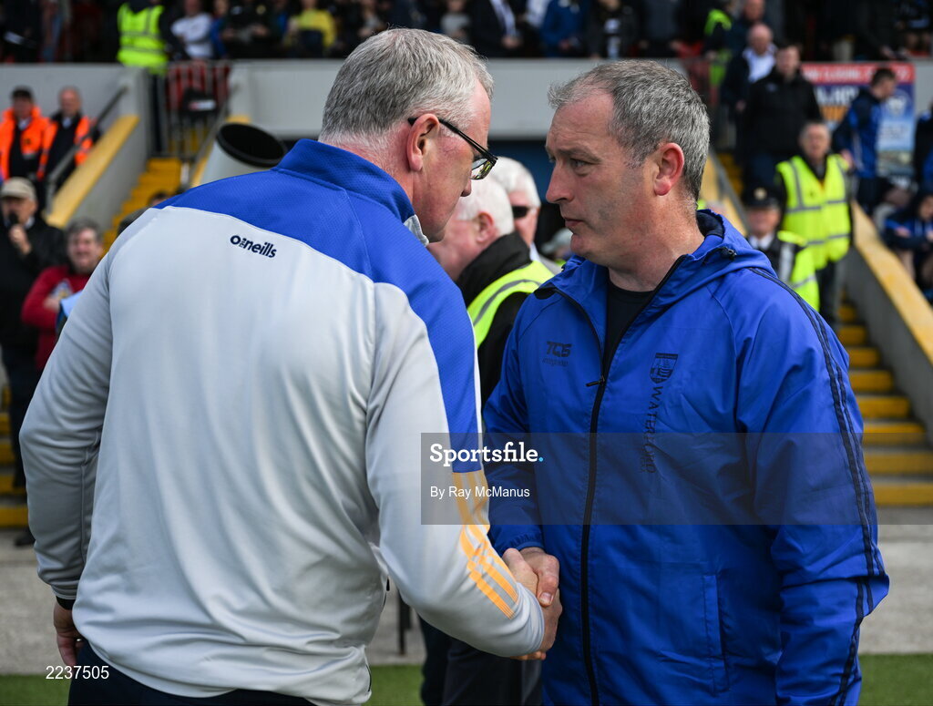 22 May 2022; The two managers, Brian Lohan and Liam Cahill, shake hands after the Munster GAA Hurling Senior Championship Round 5 match between Clare and Waterford at Cusack Park in Ennis, Clare. Photo by Ray McManus/Sportsfile