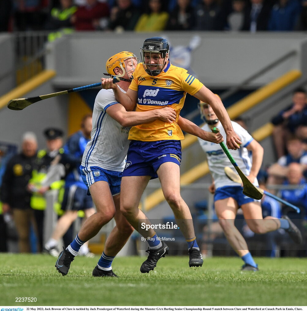 22 May 2022; Jack Browne of Clare is tackled by Jack Prendergast of Waterford during the Munster GAA Hurling Senior Championship Round 5 match between Clare and Waterford at Cusack Park in Ennis, Clare. Photo by Ray McManus/Sportsfile