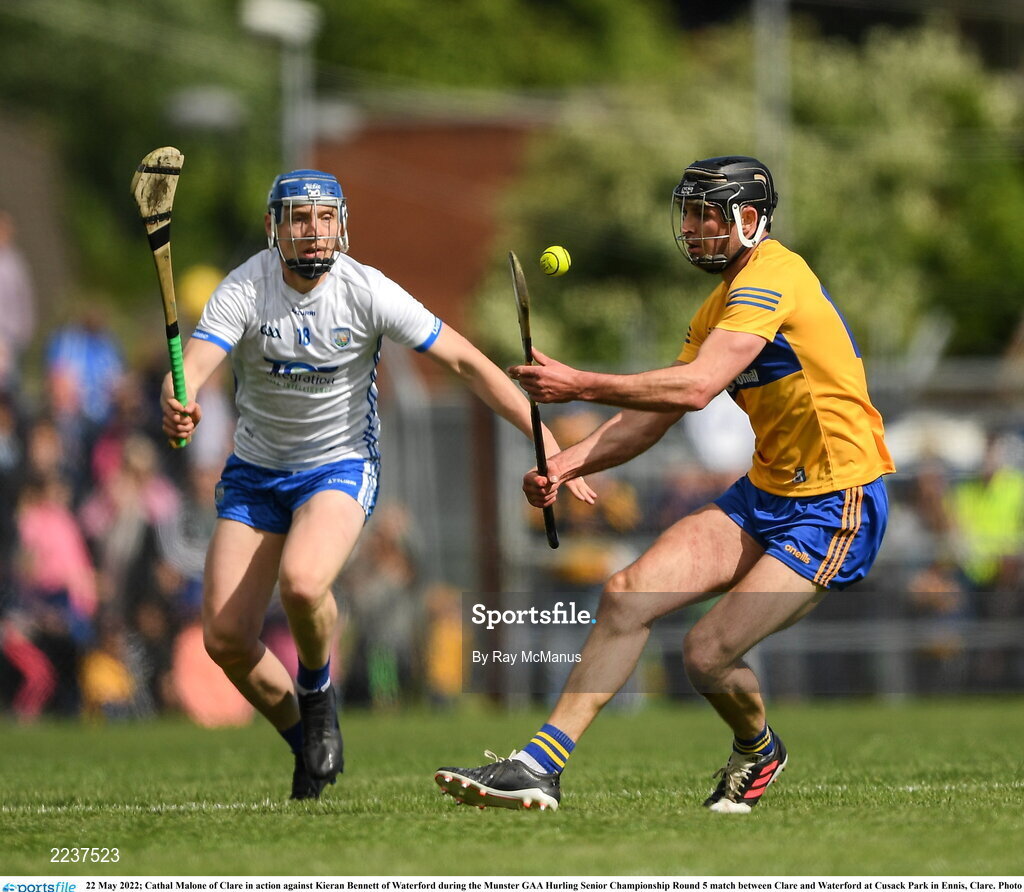 22 May 2022; Cathal Malone of Clare in action against Kieran Bennett of Waterford during the Munster GAA Hurling Senior Championship Round 5 match between Clare and Waterford at Cusack Park in Ennis, Clare. Photo by Ray McManus/Sportsfile