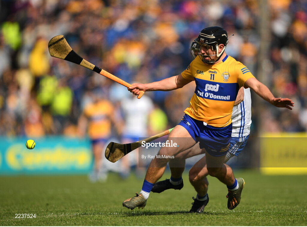 22 May 2022; David Reidy of Clare is tackled by Ian Kenny of Waterford during the Munster GAA Hurling Senior Championship Round 5 match between Clare and Waterford at Cusack Park in Ennis, Clare. Photo by Ray McManus/Sportsfile