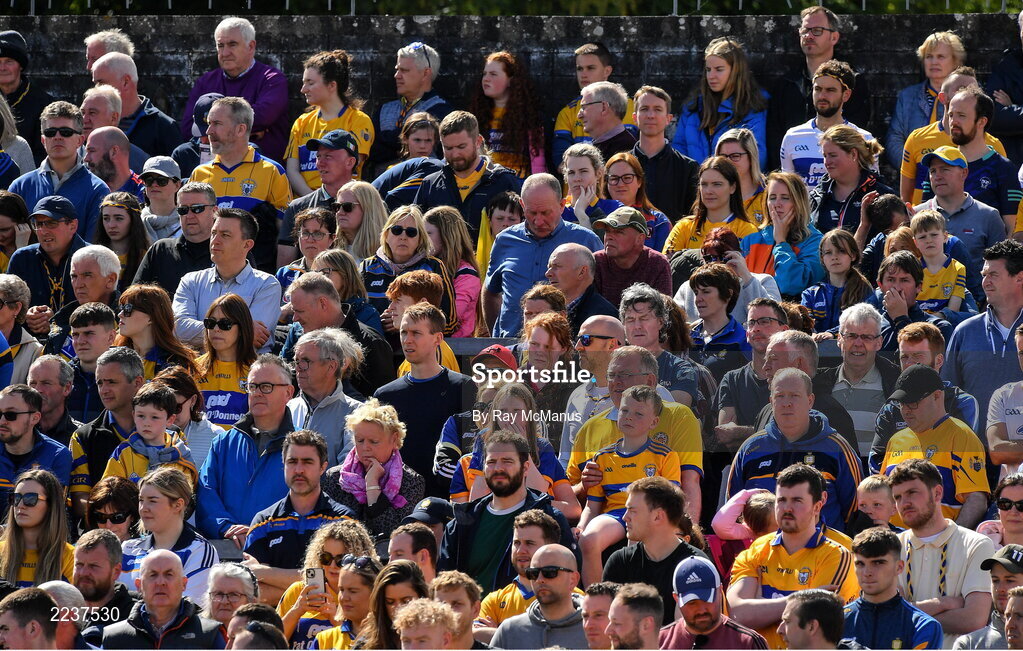 22 May 2022; Supporters stand to attention during a moment of silence to honour the late Sean Brogan, Chairman of the Scarriff GAA Club before the Munster GAA Hurling Senior Championship Round 5 match between Clare and Waterford at Cusack Park in Ennis, Clare. Photo by Ray McManus/Sportsfile