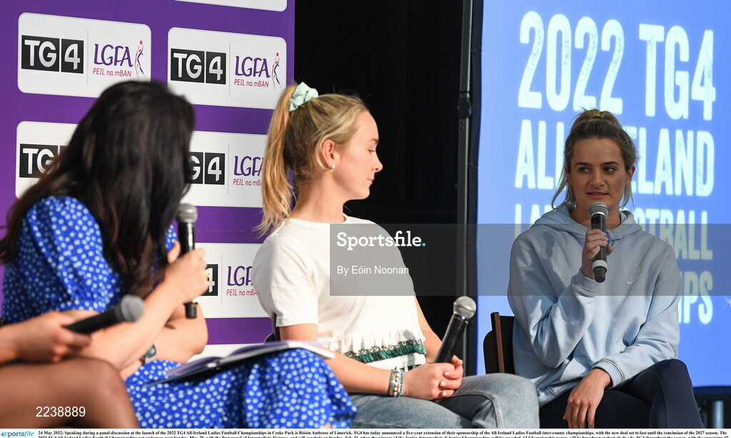 24 May 2022; Speaking during a panal discussion at the launch of the 2022 TG4 All-Ireland Ladies Football Championships in Croke Park is Róisín Ambrose of Limerick. TG4 has today announced a five-year extension of their sponsorship of the All-Ireland Ladies Football inter-county championships, with the new deal set to last until the conclusion of the 2027 season. The 2022 TG4 All-Ireland Ladies Football Championships get underway next Sunday, May 29, with the first round of Intermediate Fixtures, and will conclude on Sunday, July 31, when the winners of the Junior, Intermediate & Senior Championships will be revealed. 13 Championship games will be broadcast exclusively live by TG4 throughout the season, with the remaining 47 games available to view on the LGFA and TG4’s dedicated online platform: https://page.inplayer.com/lgfaseason2022/tg4.html In addition, the TG4 Leinster Senior Final between Dublin and Meath will also be televised live by TG4 from Croke Park next Saturday, May 28. #ProperFan . Photo by Eóin Noonan/Sportsfile