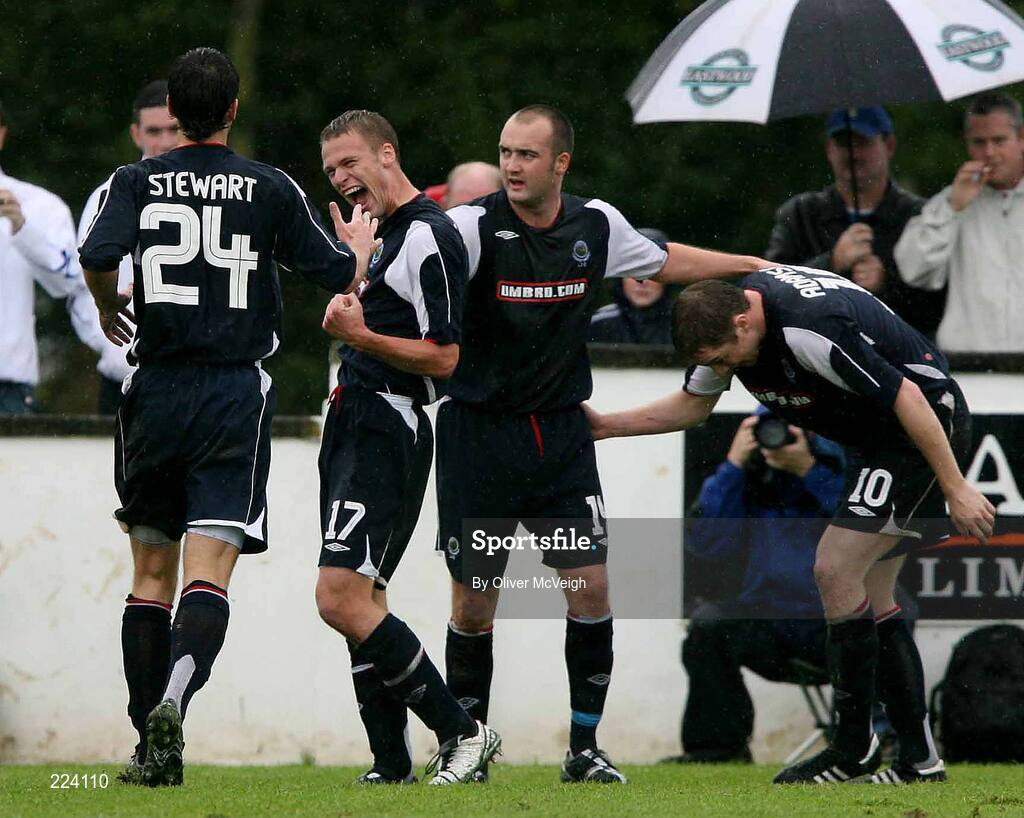 30 September 2006; Peter Thompson, centre, Linfield, celebrates with team-mates Thomas Stewart, 24, and Paul McAreavey after scoring his side's first goal. Carnegie Premier League, Limavady United v Linfield, Showgrounds, Limavady, Co Derry. Picture credit: Oliver McVeigh / SPORTSFILE
