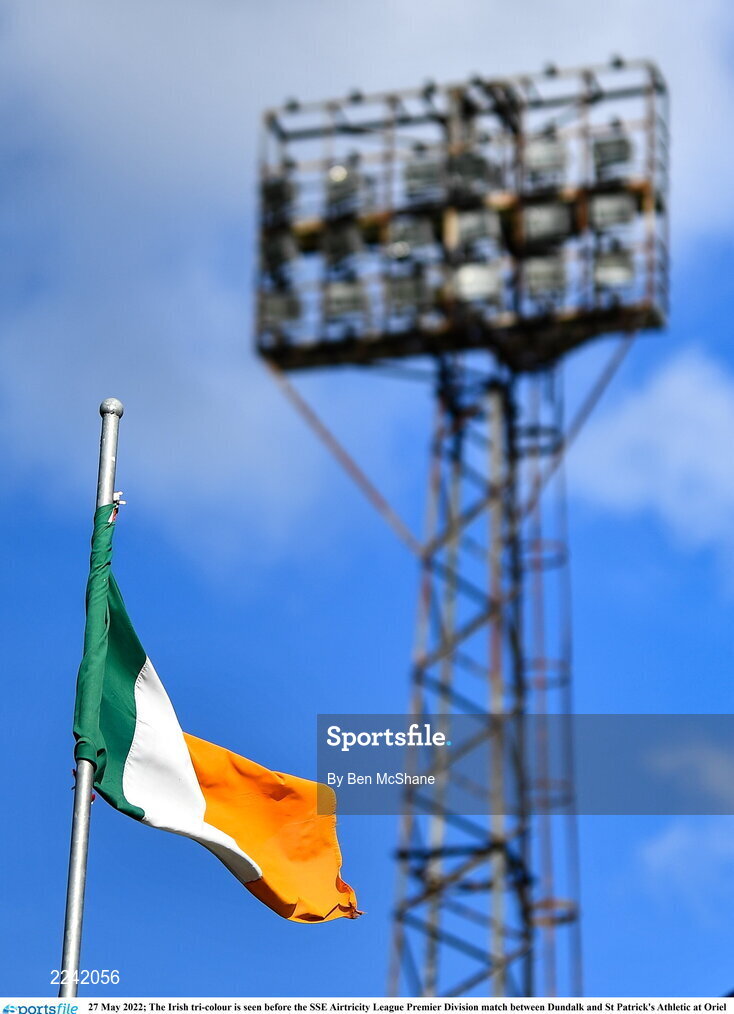 27 May 2022; The Irish tri-colour is seen before the SSE Airtricity League Premier Division match between Dundalk and St Patrick's Athletic at Oriel Park in Dundalk, Louth. Photo by Ben McShane/Sportsfile