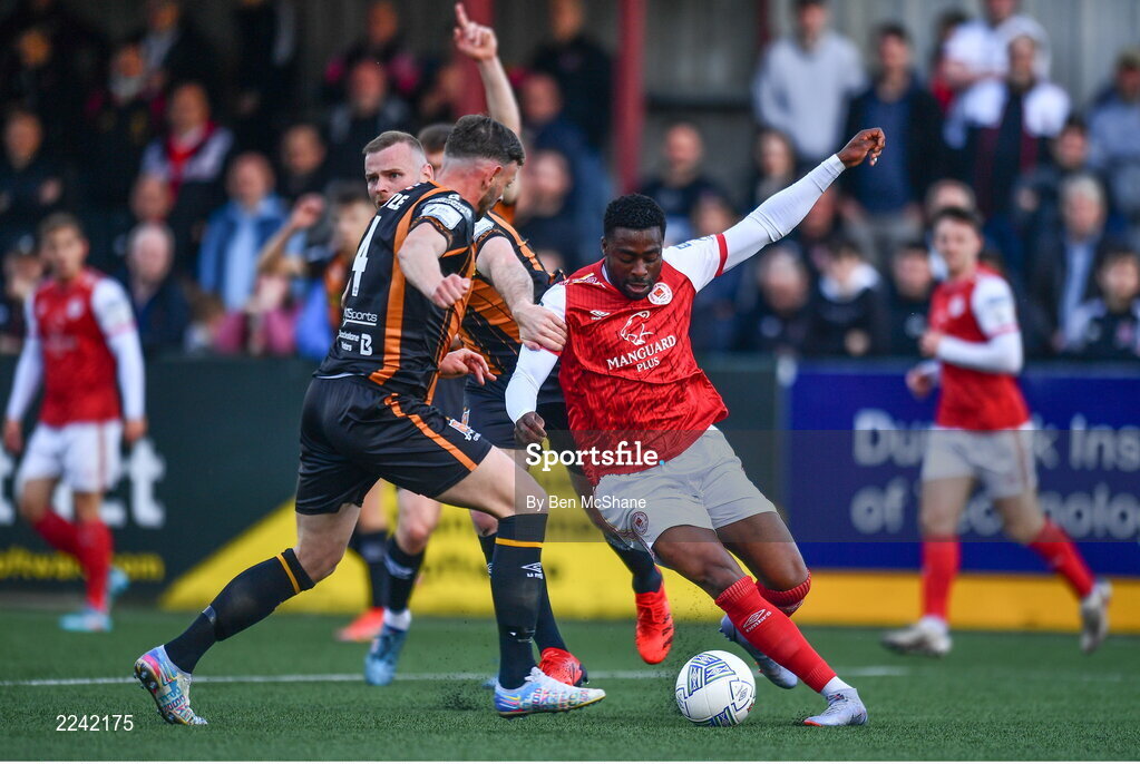 27 May 2022; Tunde Owolabi of St Patrick's Athletic in action against Mark Connolly and Andy Boyle of Dundalk during the SSE Airtricity League Premier Division match between Dundalk and St Patrick's Athletic at Oriel Park in Dundalk, Louth. Photo by Ben McShane/Sportsfile