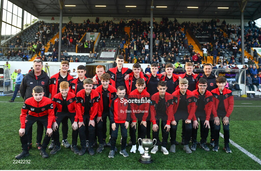 27 May 2022; Bellurgan United U15 players parade their SFAI Under-15 National Cup at half-time of the SSE Airtricity League Premier Division match between Dundalk and St Patrick's Athletic at Oriel Park in Dundalk, Louth. Photo by Ben McShane/Sportsfile