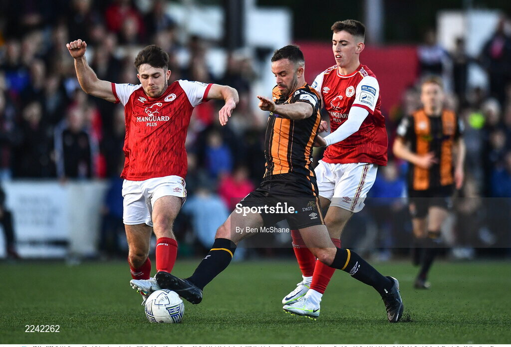 27 May 2022; Robbie Benson of Dundalk in action against Adam O'Reilly, left, and Darragh Burns of St Patrick's Athletic during the SSE Airtricity League Premier Division match between Dundalk and St Patrick's Athletic at Oriel Park in Dundalk, Louth. Photo by Ben McShane/Sportsfile