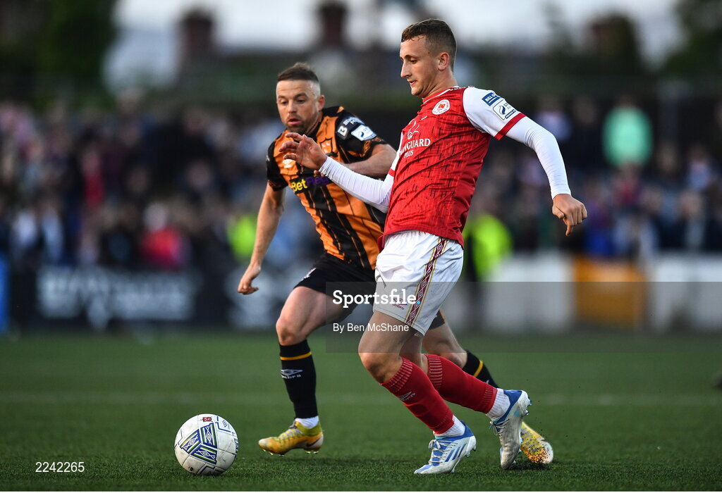 27 May 2022; Sam Curtis of St Patrick's Athletic in action against Keith Ward of Dundalk during the SSE Airtricity League Premier Division match between Dundalk and St Patrick's Athletic at Oriel Park in Dundalk, Louth. Photo by Ben McShane/Sportsfile