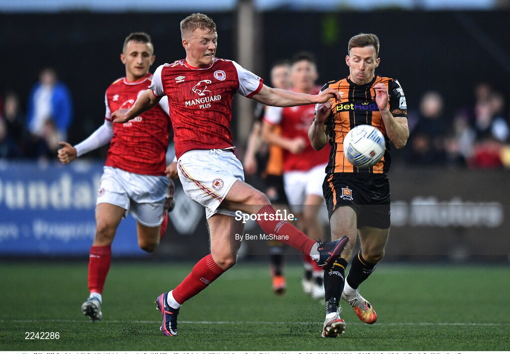 27 May 2022; Tom Grivosti of St Patrick's Athletic in action against David McMillan of Dundalk during the SSE Airtricity League Premier Division match between Dundalk and St Patrick's Athletic at Oriel Park in Dundalk, Louth. Photo by Ben McShane/Sportsfile