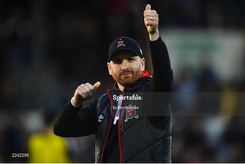 27 May 2022; Dundalk head coach Stephen O'Donnell gestures toward the supporters after his side's victory in the SSE Airtricity League Premier Division match between Dundalk and St Patrick's Athletic at Oriel Park in Dundalk, Louth. Photo by Ben McShane/Sportsfile