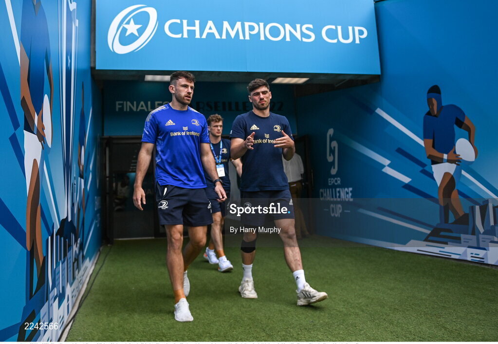 28 May 2022; Hugo Keenan, left, and Jimmy O'Brien of Leinster before the Heineken Champions Cup Final match between Leinster and La Rochelle at Stade Velodrome in Marseille, France. Photo by Harry Murphy/Sportsfile