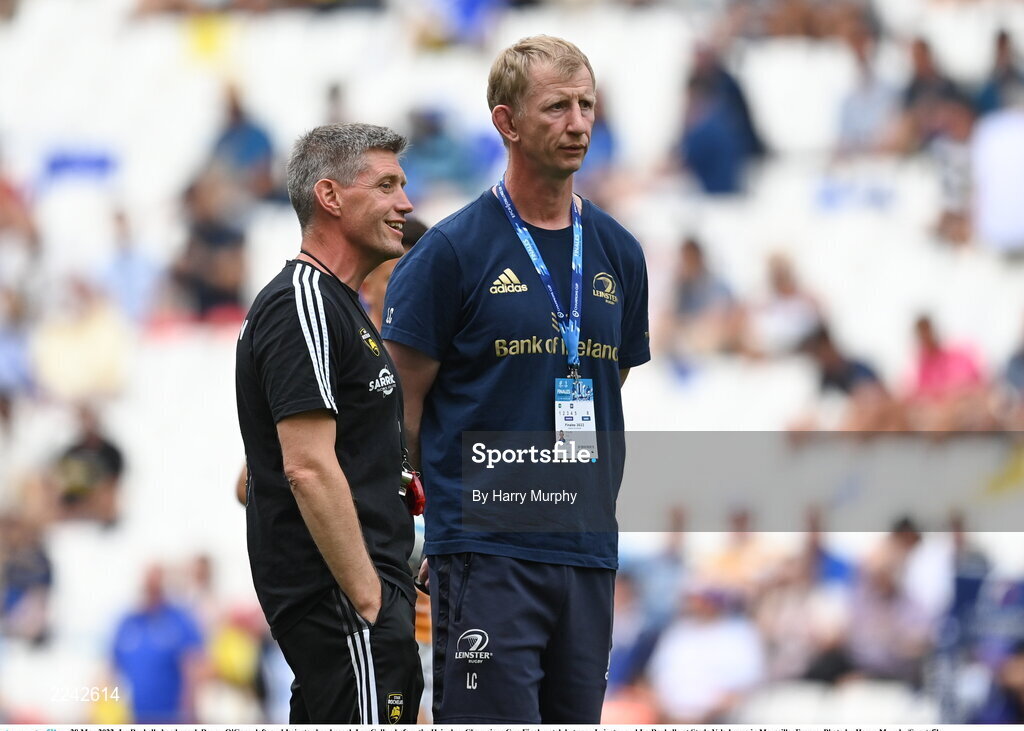 28 May 2022; La Rochelle head coach Ronan O'Gara, left, and Leinster head coach Leo Cullen before the Heineken Champions Cup Final match between Leinster and La Rochelle at Stade Velodrome in Marseille, France. Photo by Harry Murphy/Sportsfile