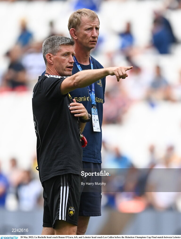 28 May 2022; La Rochelle head coach Ronan O'Gara, left, and Leinster head coach Leo Cullen before the Heineken Champions Cup Final match between Leinster and La Rochelle at Stade Velodrome in Marseille, France. Photo by Harry Murphy/Sportsfile