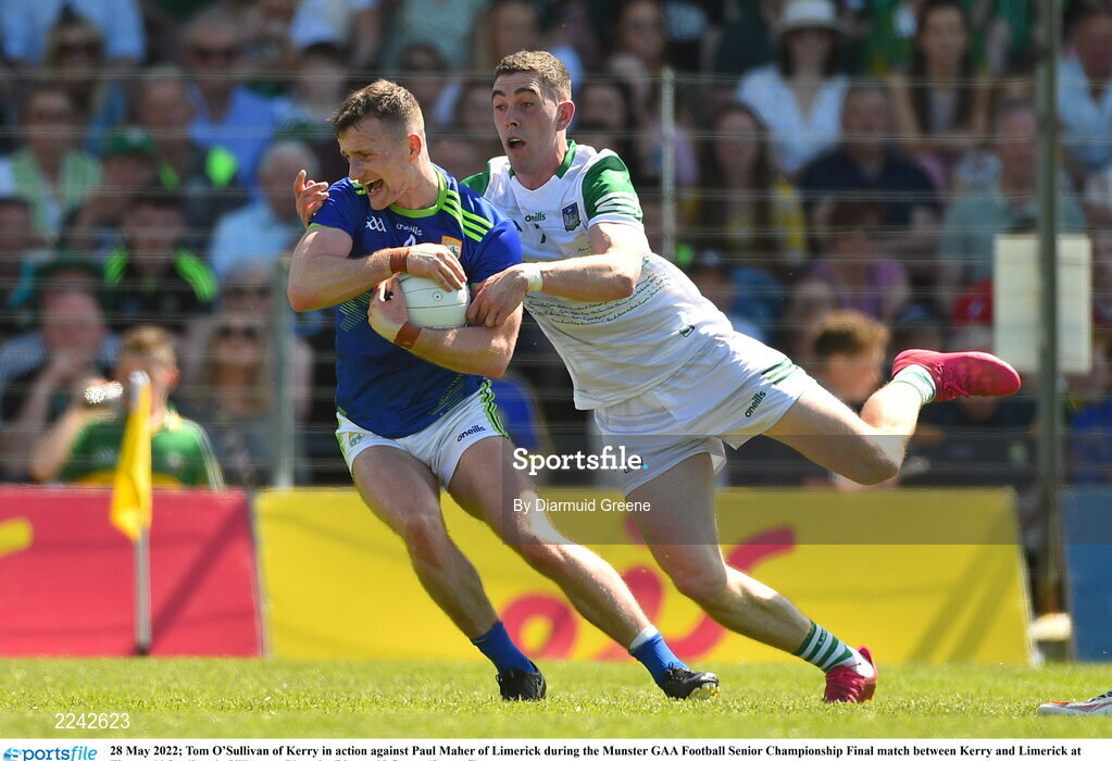 28 May 2022; Tom O’Sullivan of Kerry in action against Paul Maher of Limerick during the Munster GAA Football Senior Championship Final match between Kerry and Limerick at Fitzgerald Stadium in Killarney. Photo by Diarmuid Greene/Sportsfile