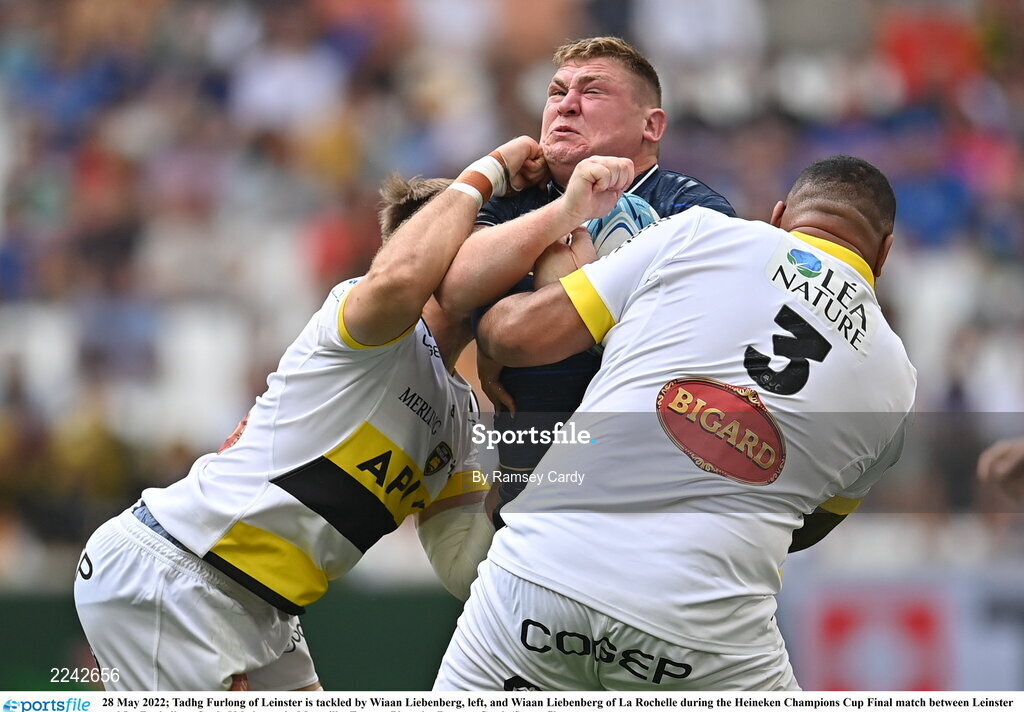28 May 2022; Tadhg Furlong of Leinster is tackled by Wiaan Liebenberg, left, and Wiaan Liebenberg of La Rochelle during the Heineken Champions Cup Final match between Leinster and La Rochelle at Stade Velodrome in Marseille, France. Photo by Ramsey Cardy/Sportsfile