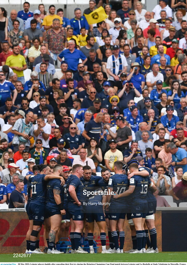 28 May 2022; Leinster players huddle after conceding their first try during the Heineken Champions Cup Final match between Leinster and La Rochelle at Stade Velodrome in Marseille, France. Photo by Harry Murphy/Sportsfile