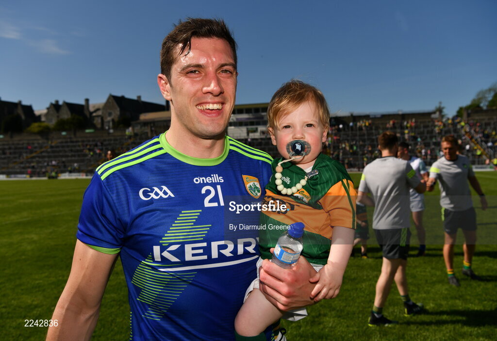 28 May 2022; David Moran with his son Eli after the Munster GAA Football Senior Championship Final match between Kerry and Limerick at Fitzgerald Stadium in Killarney. Photo by Diarmuid Greene/Sportsfile