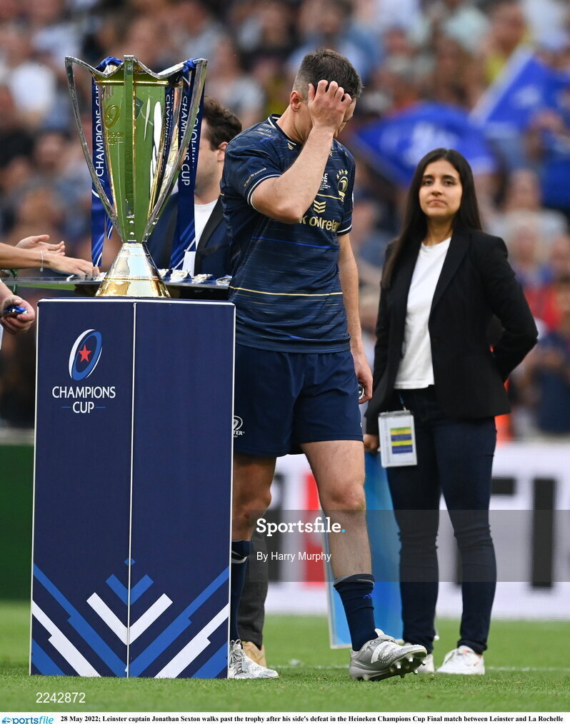 28 May 2022; Leinster captain Jonathan Sexton walks past the trophy after his side's defeat in the Heineken Champions Cup Final match between Leinster and La Rochelle at Stade Velodrome in Marseille, France. Photo by Harry Murphy/Sportsfile