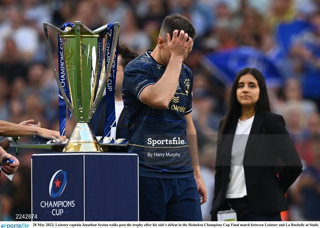 28 May 2022; Leinster captain Jonathan Sexton walks past the trophy after his side's defeat in the Heineken Champions Cup Final match between Leinster and La Rochelle at Stade Velodrome in Marseille, France. Photo by Harry Murphy/Sportsfile