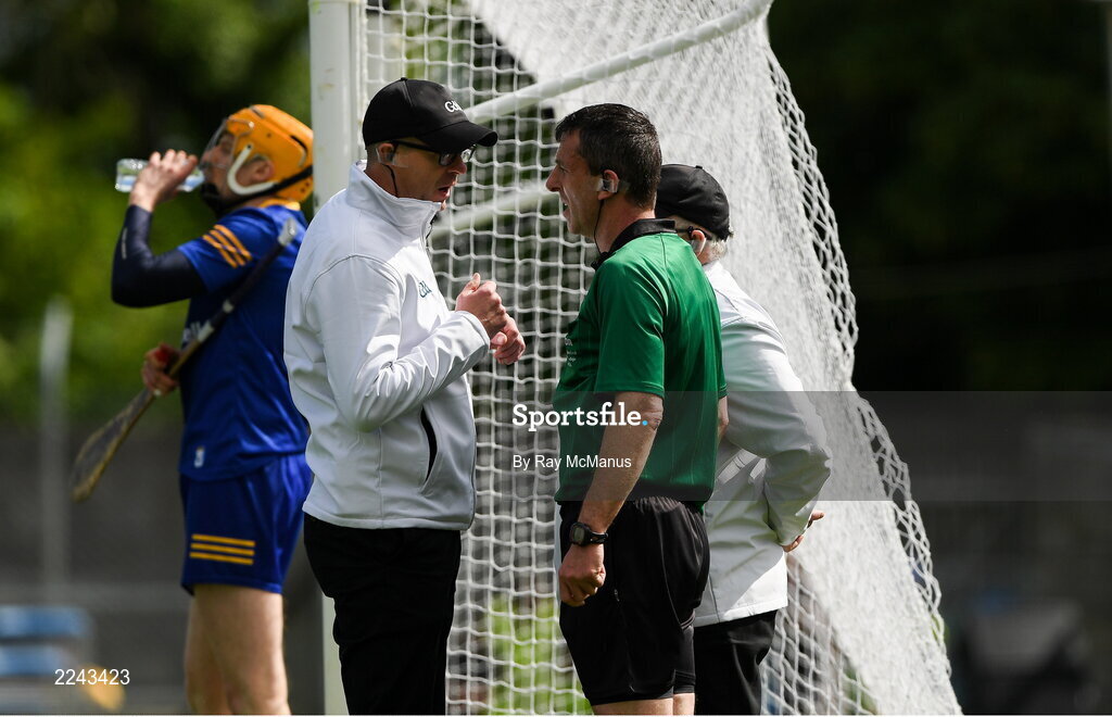 22 May 2022; Referee Paud O'Dwyer talks to his umpires, before issuing two yellow cards, during the Munster GAA Hurling Senior Championship Round 5 match between Clare and Waterford at Cusack Park in Ennis, Clare. Photo by Ray McManus/Sportsfile
