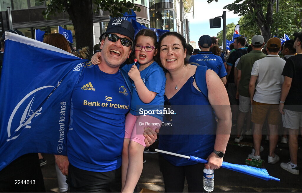 28 May 2022; Leinster supporters Barry and Elaine McHugh, with daughter Ella, before the Heineken Champions Cup Final match between Leinster and La Rochelle at Stade Velodrome in Marseille, France. Photo by Ramsey Cardy/Sportsfile