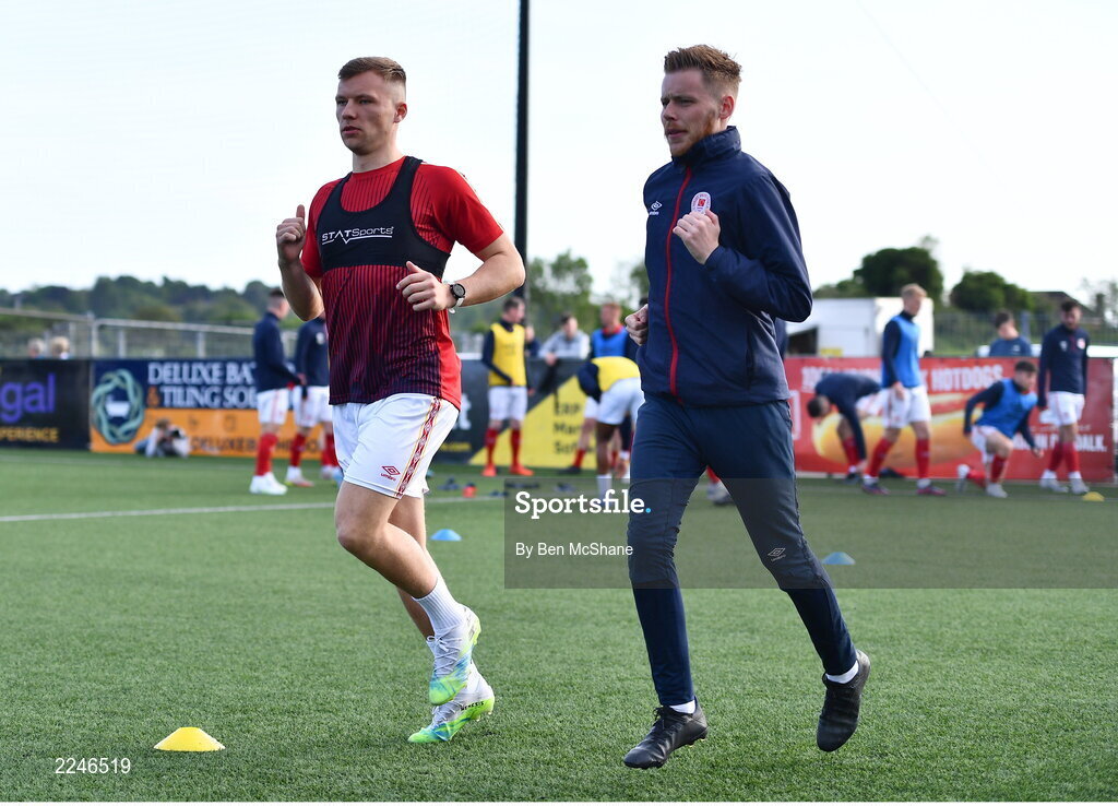 27 May 2022; Jamie Lennon of St Patrick's Athletic, left, and St Patrick's Athletic head of medical Sam Rice before the SSE Airtricity League Premier Division match between Dundalk and St Patrick's Athletic at Oriel Park in Dundalk, Louth. Photo by Ben McShane/Sportsfile