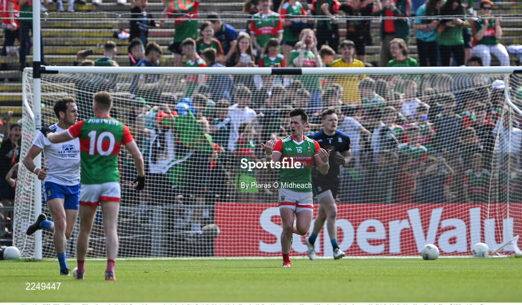 4 June 2022; Cillian O'Connor of Mayo after scoring his side's first goal, from a penalty, during the GAA Football All-Ireland Senior Championship Round 1 match between Mayo and Monaghan at Hastings Insurance MacHale Park in Castlebar, Mayo. Photo by Piaras Ó Mídheach/Sportsfile