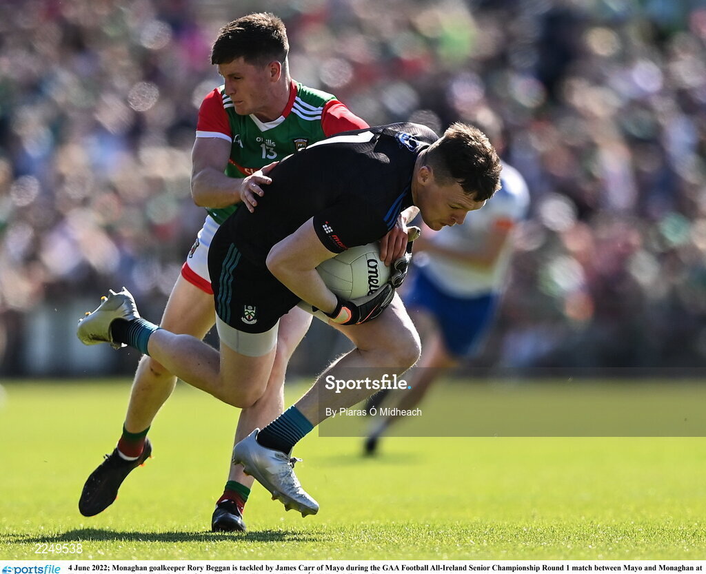 4 June 2022; Monaghan goalkeeper Rory Beggan is tackled by James Carr of Mayo during the GAA Football All-Ireland Senior Championship Round 1 match between Mayo and Monaghan at Hastings Insurance MacHale Park in Castlebar, Mayo. Photo by Piaras Ó Mídheach/Sportsfile