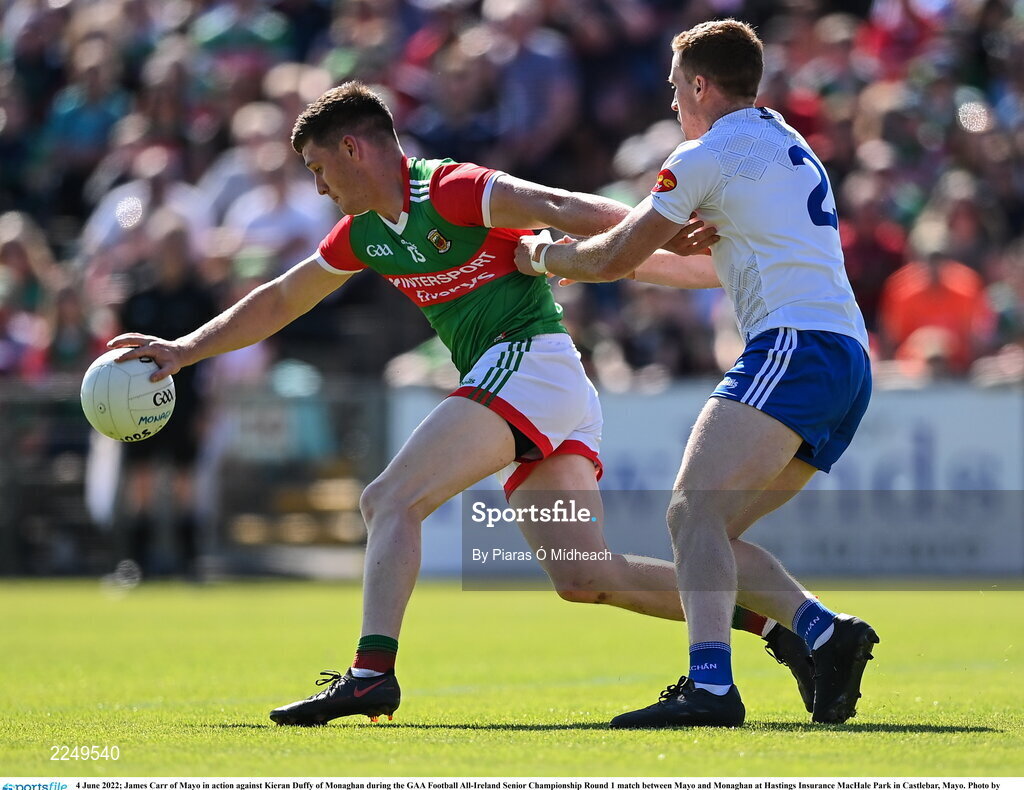 4 June 2022; James Carr of Mayo in action against Kieran Duffy of Monaghan during the GAA Football All-Ireland Senior Championship Round 1 match between Mayo and Monaghan at Hastings Insurance MacHale Park in Castlebar, Mayo. Photo by Piaras Ó Mídheach/Sportsfile