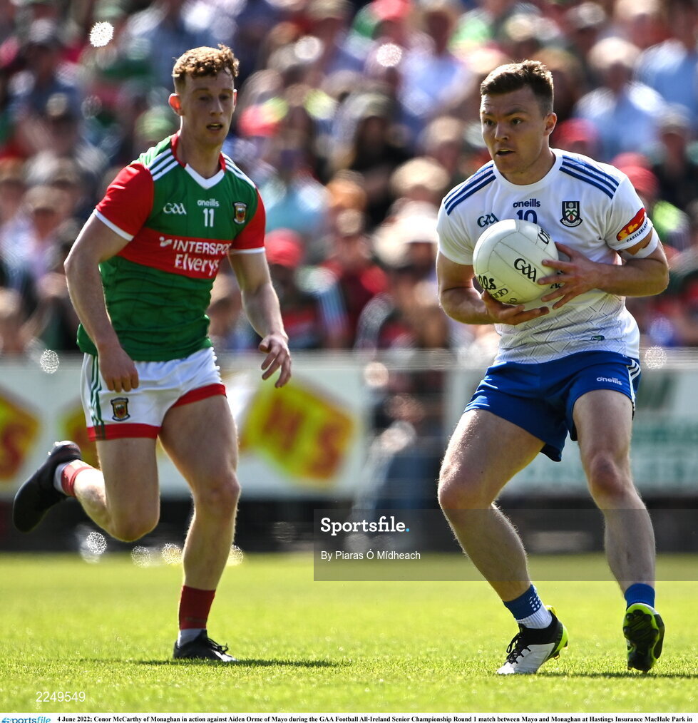 4 June 2022; Conor McCarthy of Monaghan in action against Aiden Orme of Mayo during the GAA Football All-Ireland Senior Championship Round 1 match between Mayo and Monaghan at Hastings Insurance MacHale Park in Castlebar, Mayo. Photo by Piaras Ó Mídheach/Sportsfile