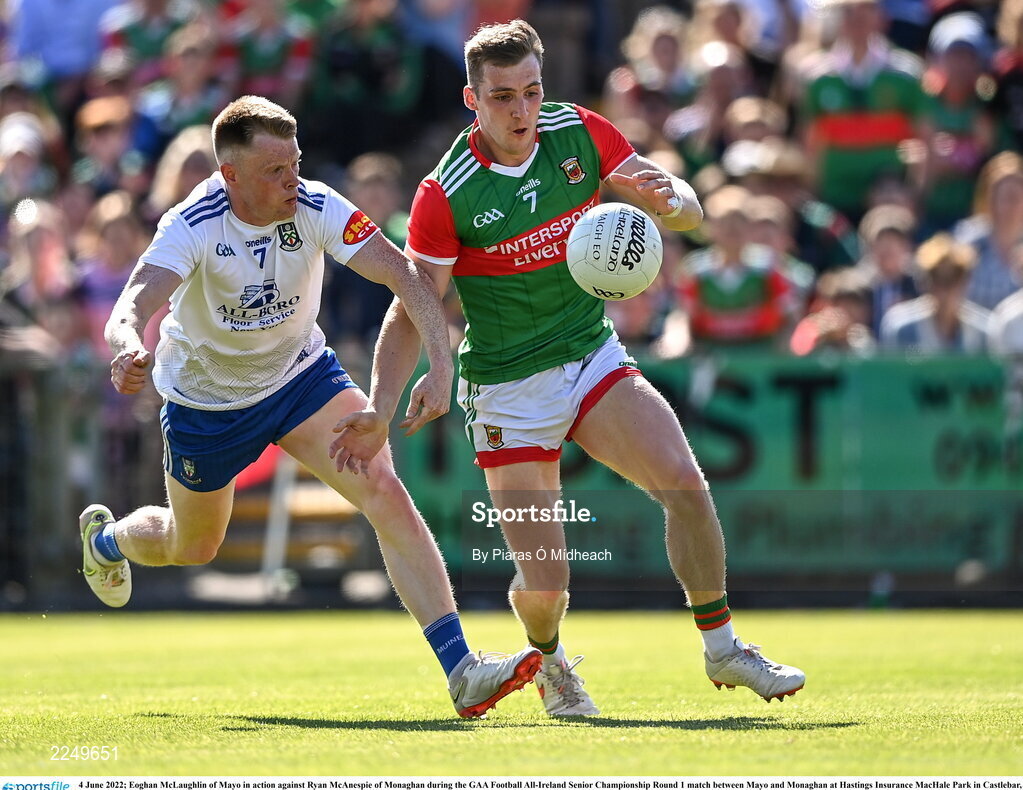 4 June 2022; Eoghan McLaughlin of Mayo in action against Ryan McAnespie of Monaghan during the GAA Football All-Ireland Senior Championship Round 1 match between Mayo and Monaghan at Hastings Insurance MacHale Park in Castlebar, Mayo. Photo by Piaras Ó Mídheach/Sportsfile
