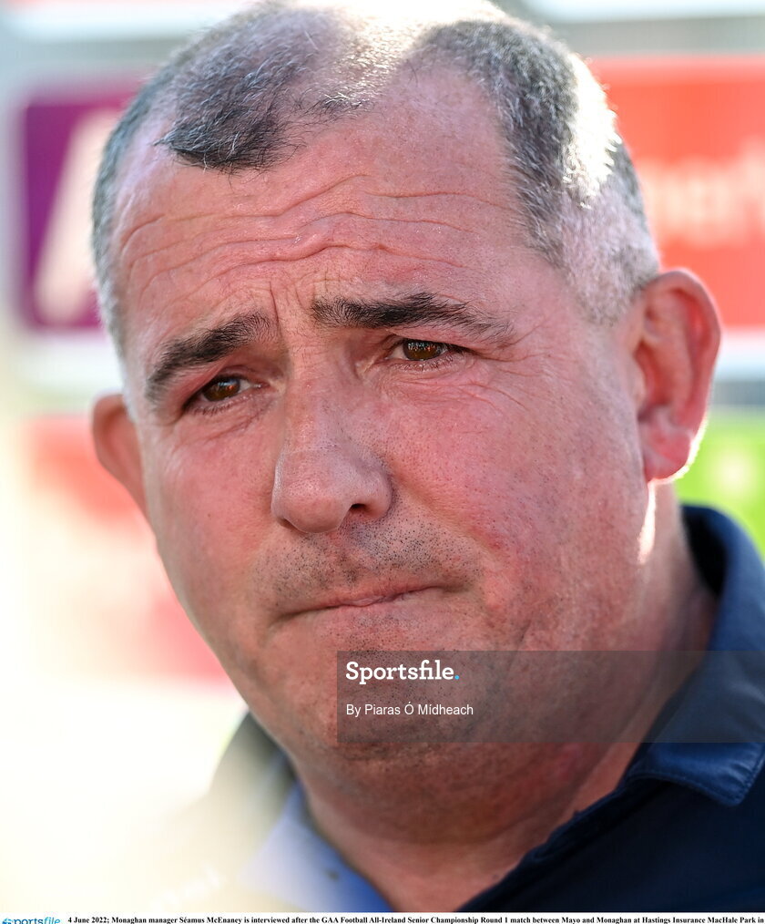 4 June 2022; Monaghan manager Séamus McEnaney is interviewed after the GAA Football All-Ireland Senior Championship Round 1 match between Mayo and Monaghan at Hastings Insurance MacHale Park in Castlebar, Mayo. Photo by Piaras Ó Mídheach/Sportsfile