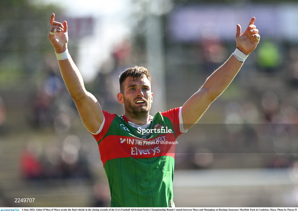 4 June 2022; Aidan O'Shea of Mayo awaits the final whistle in the closing seconds of the GAA Football All-Ireland Senior Championship Round 1 match between Mayo and Monaghan at Hastings Insurance MacHale Park in Castlebar, Mayo. Photo by Piaras Ó Mídheach/Sportsfile