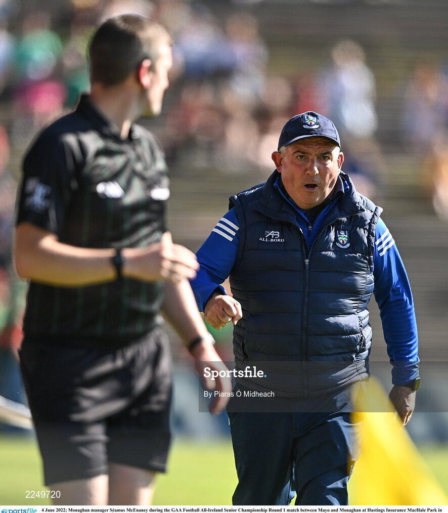 4 June 2022; Monaghan manager Séamus McEnaney during the GAA Football All-Ireland Senior Championship Round 1 match between Mayo and Monaghan at Hastings Insurance MacHale Park in Castlebar, Mayo. Photo by Piaras Ó Mídheach/Sportsfile