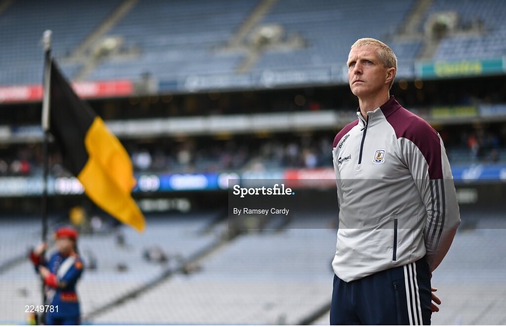 4 June 2022; Galway manager Henry Shefflin during the playing of the National Anthem before the Leinster GAA Hurling Senior Championship Final match between Galway and Kilkenny at Croke Park in Dublin. Photo by Ramsey Cardy/Sportsfile