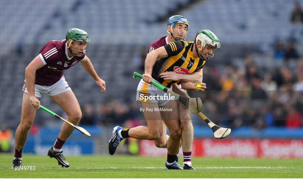 4 June 2022; Paddy Deegan of Kilkenny is tackled by Conor Cooney and Brian Concannon of Galway, left, during the Leinster GAA Hurling Senior Championship Final match between Galway and Kilkenny at Croke Park in Dublin. Photo by Ray McManus/Sportsfile