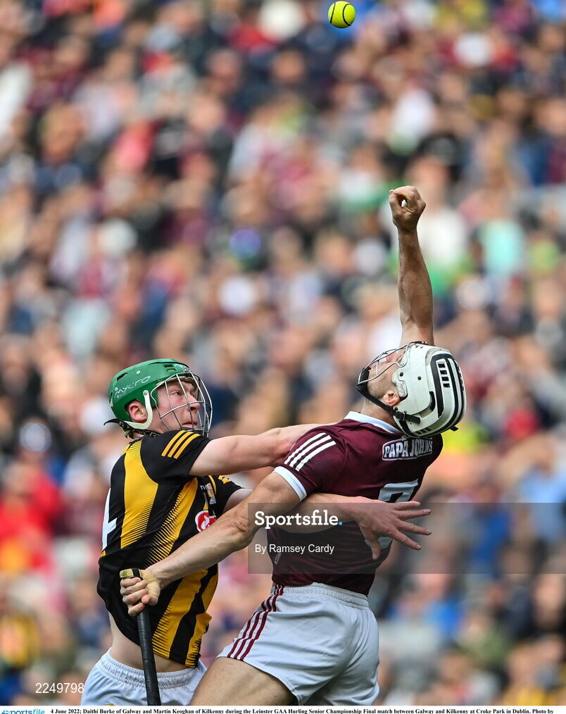4 June 2022; Daithí Burke of Galway and Martin Keoghan of Kilkenny during the Leinster GAA Hurling Senior Championship Final match between Galway and Kilkenny at Croke Park in Dublin. Photo by Ramsey Cardy/Sportsfile