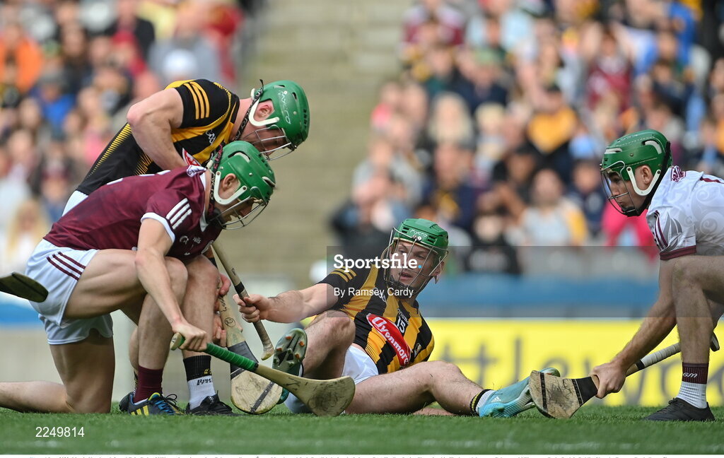 4 June 2022; Martin Keoghan, left, and Eoin Cody of Kilkenny in action against Galway goalkeeper Éanna Murphy and Jack Grealish during the Leinster GAA Hurling Senior Championship Final match between Galway and Kilkenny at Croke Park in Dublin. Photo by Ramsey Cardy/Sportsfile