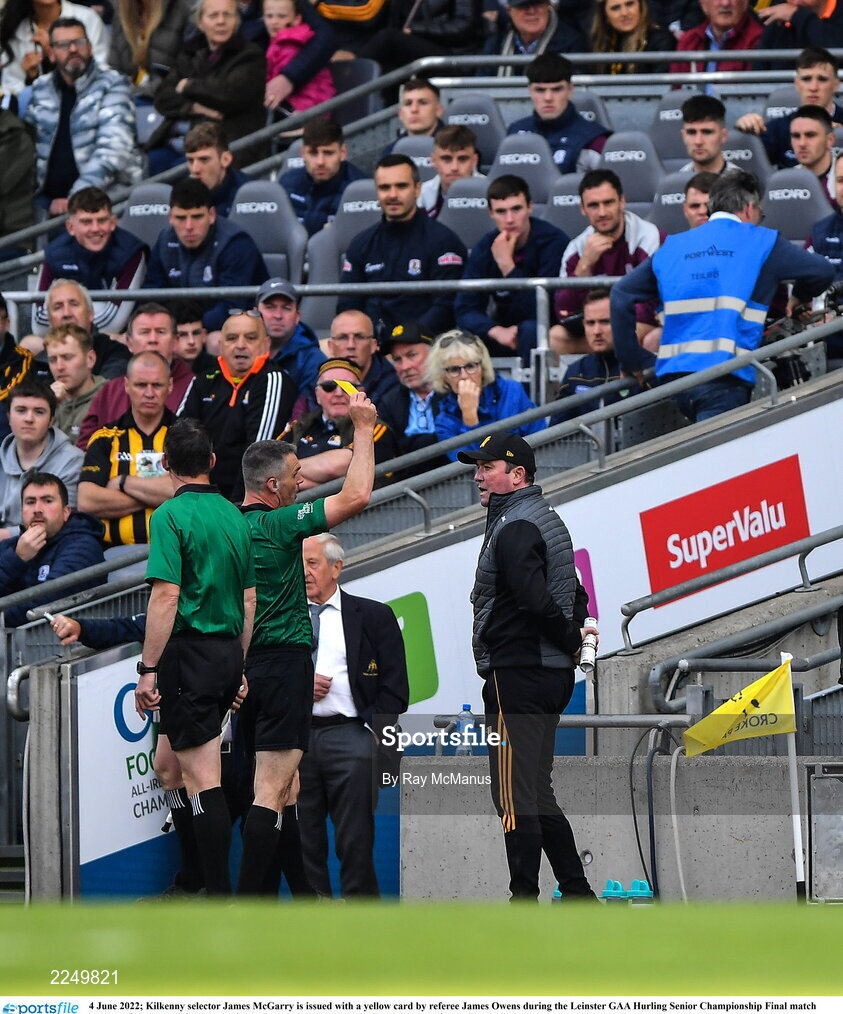 4 June 2022; Kilkenny selector James McGarry is issued with a yellow card by referee James Owens during the Leinster GAA Hurling Senior Championship Final match between Galway and Kilkenny at Croke Park in Dublin. Photo by Ray McManus/Sportsfile