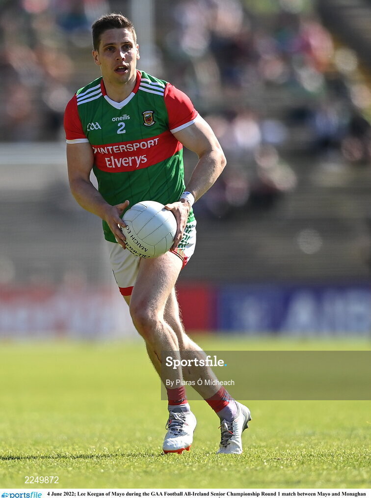 4 June 2022; Lee Keegan of Mayo during the GAA Football All-Ireland Senior Championship Round 1 match between Mayo and Monaghan at Hastings Insurance MacHale Park in Castlebar, Mayo. Photo by Piaras Ó Mídheach/Sportsfile