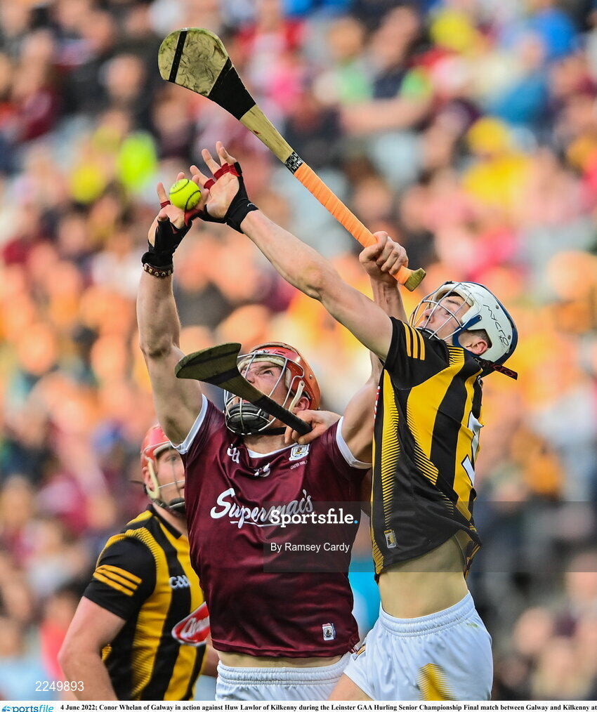 4 June 2022; Conor Whelan of Galway in action against Huw Lawlor of Kilkenny during the Leinster GAA Hurling Senior Championship Final match between Galway and Kilkenny at Croke Park in Dublin. Photo by Ramsey Cardy/Sportsfile