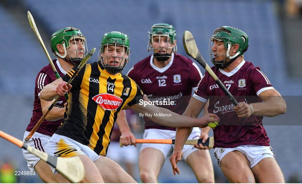 4 June 2022; Martin Keoghan of Kilkenny is tackled by Jack Grealish, left, Cathal Mannion and Fintan Burke of Galway, right, during the Leinster GAA Hurling Senior Championship Final match between Galway and Kilkenny at Croke Park in Dublin. Photo by Ray McManus/Sportsfile