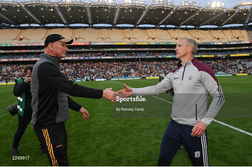 4 June 2022; Kilkenny manager Brian Cody, left, and Galway manager Henry Shefflin shake hands after the Leinster GAA Hurling Senior Championship Final match between Galway and Kilkenny at Croke Park in Dublin. Photo by Ramsey Cardy/Sportsfile
